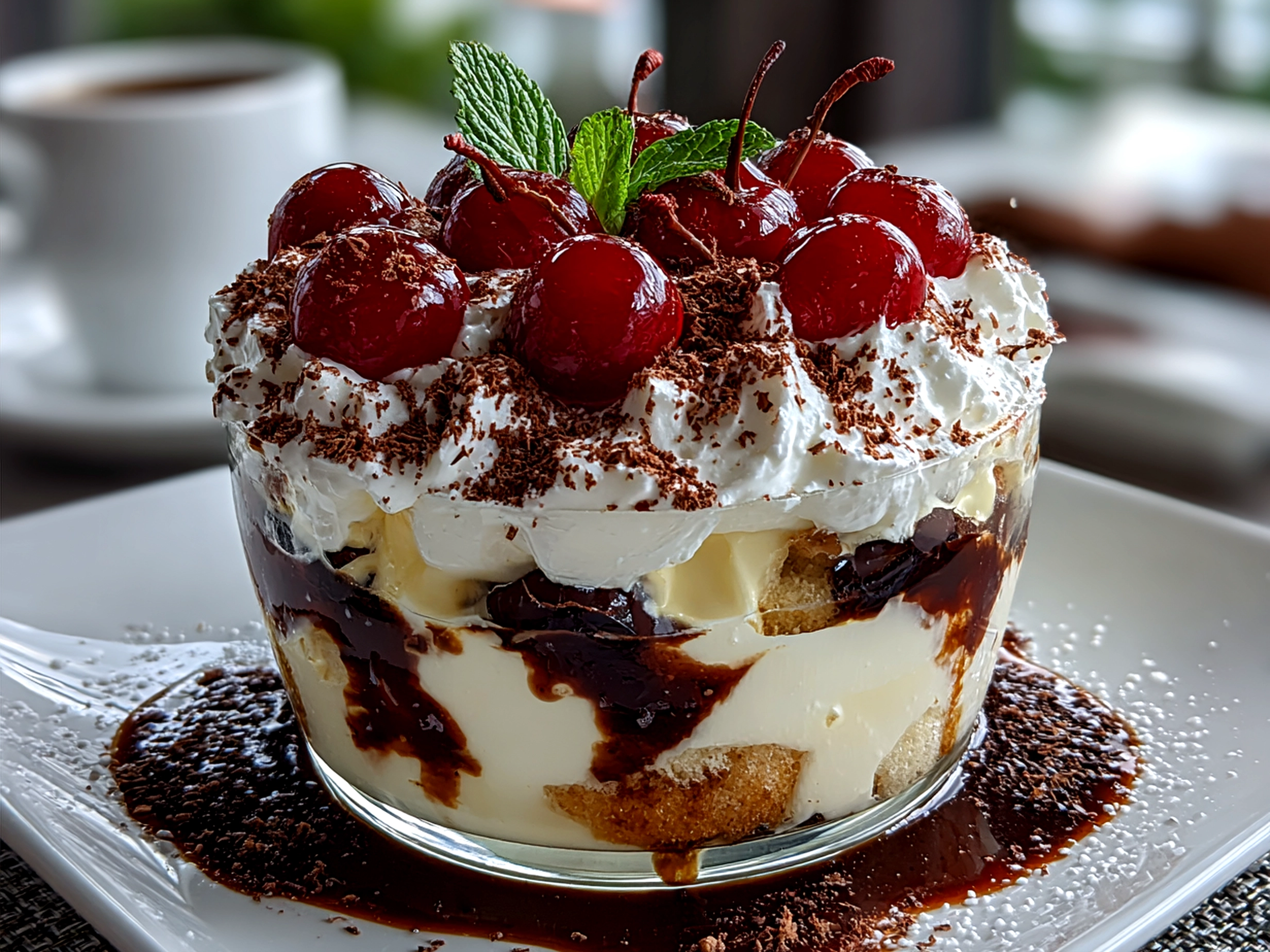 A decadent and visually stunning dessert layering rich chocolate cake, juicy cherries, and creamy whipped cream, perfect for any celebration.