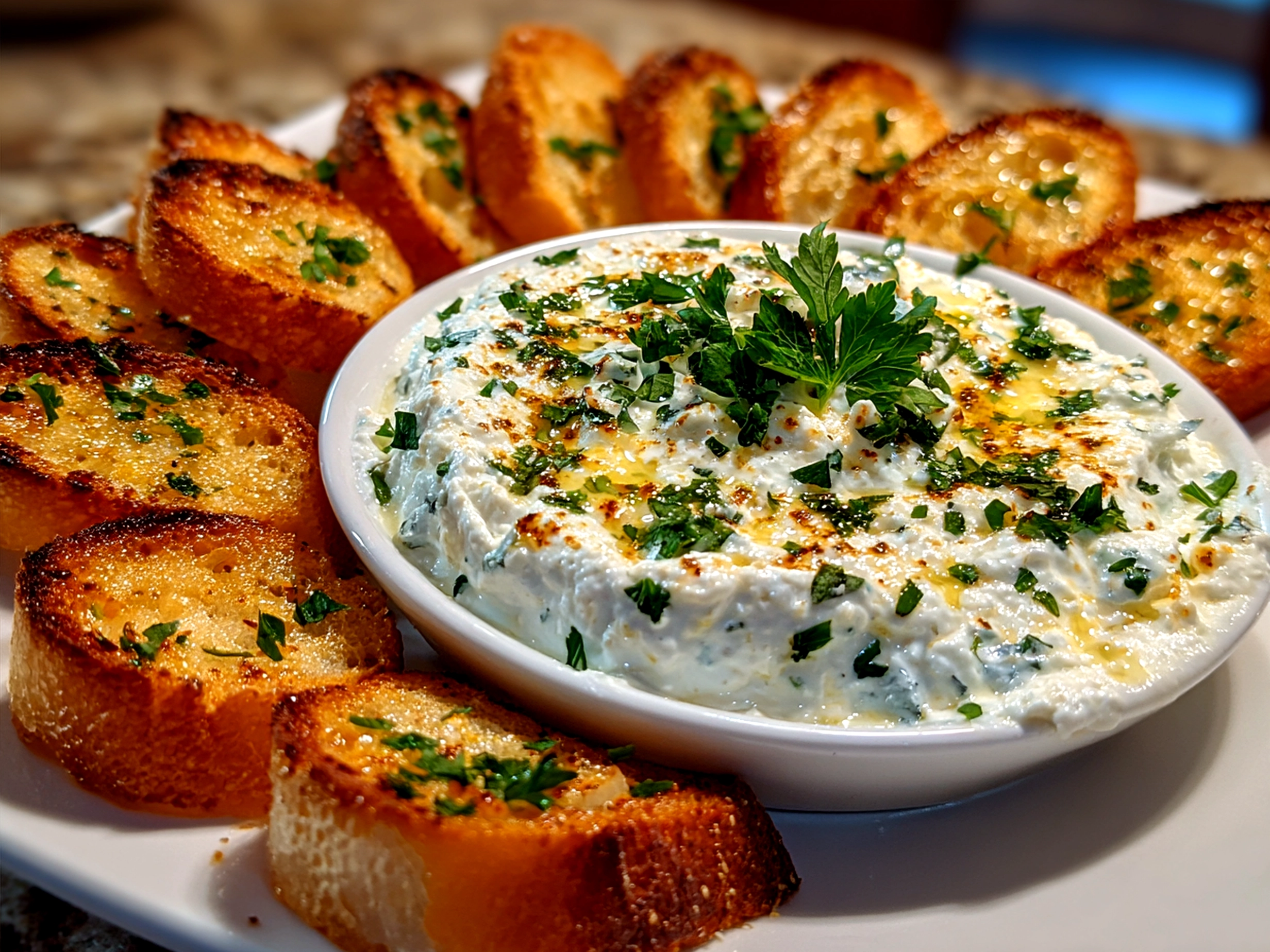 A creamy and flavorful Boursin cheese dip served with crispy, buttery crostini, perfect for entertaining or a savory snack.