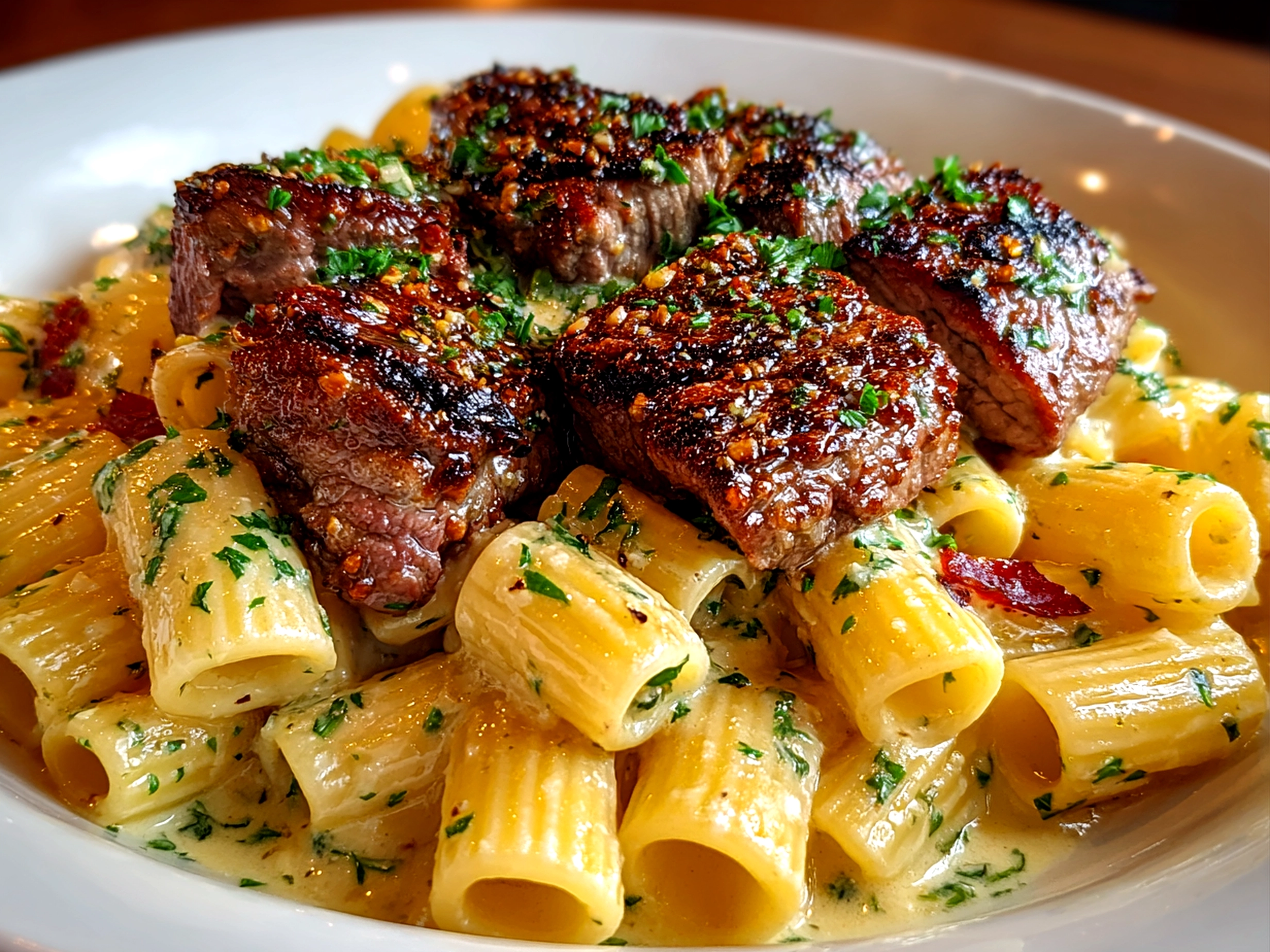 Indulge in tender steak bites tossed with rigatoni pasta in a rich, creamy garlic butter sauce for a comforting and flavorful Italian-inspired meal.