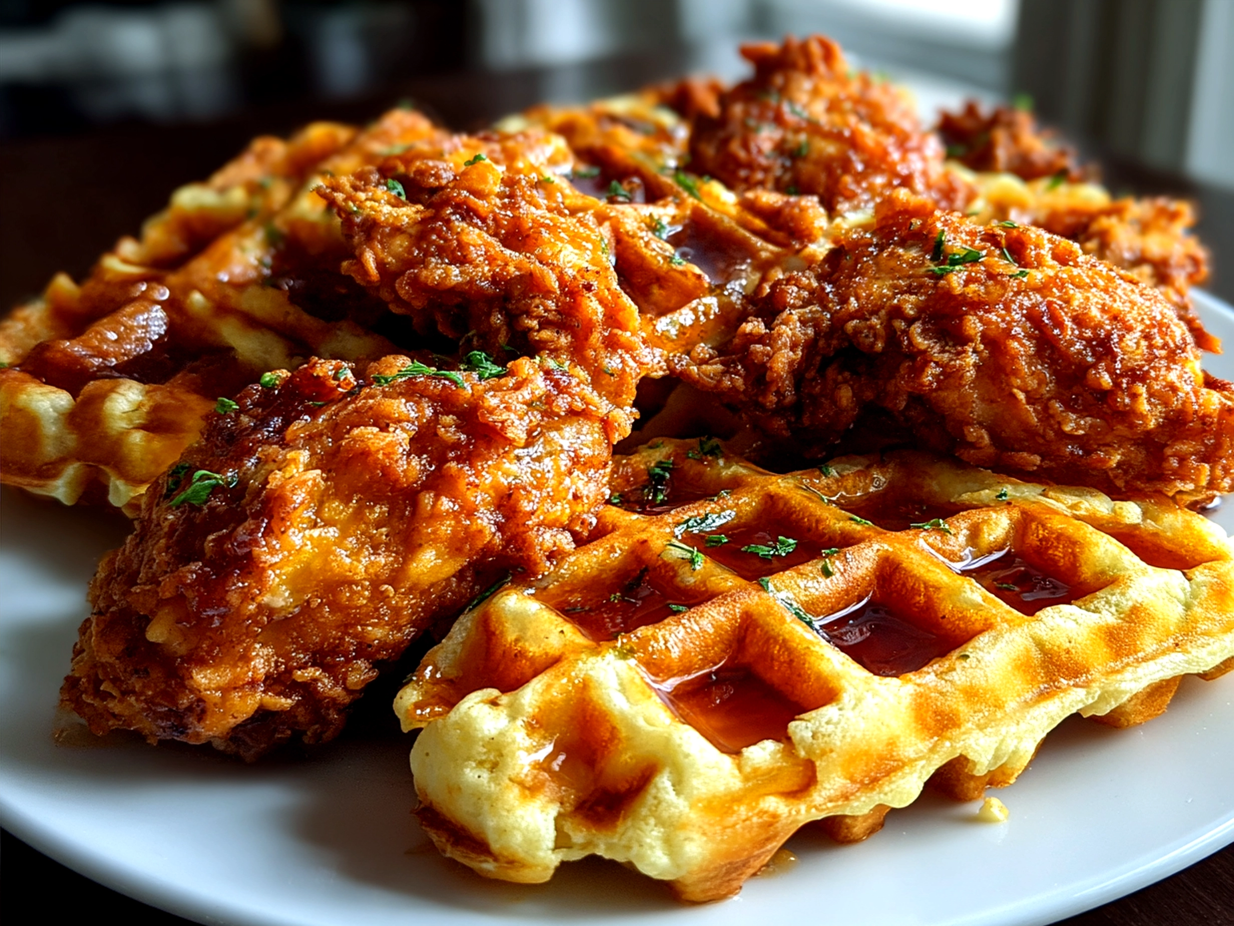 Enjoy the perfect combination of golden, crispy fried chicken paired with fluffy, buttery waffles for a delicious twist on a classic comfort dish.