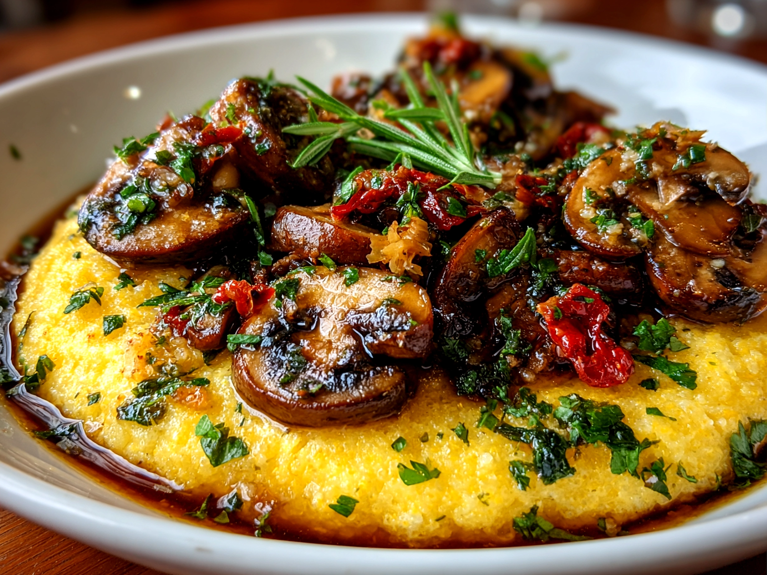 6. To assemble, spoon the creamy polenta into bowls and top generously with the sautéed mushrooms. You should smell that lovely earthiness coming from the mushrooms mixed with the buttery base—a good signal you’ve nailed it.