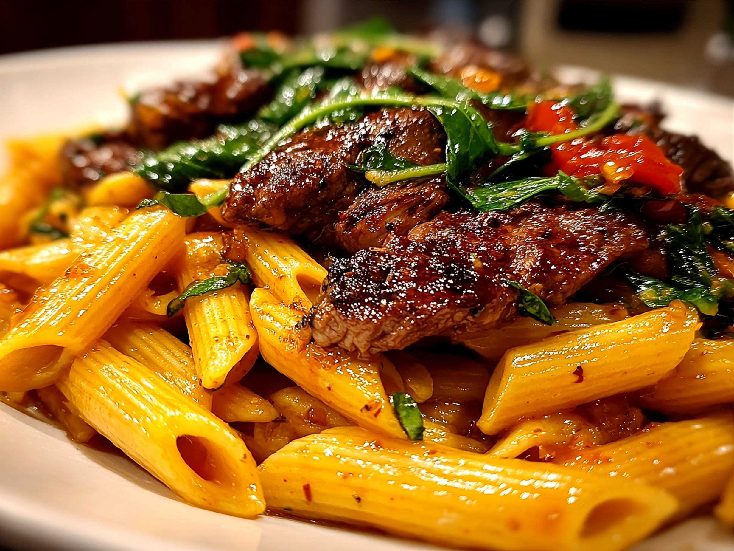 This One-Pan Spicy Honey Garlic Steak Pasta combines tender steak, a sweet and spicy honey garlic sauce, and perfectly cooked pasta for a quick and flavorful dinner all in one skillet.