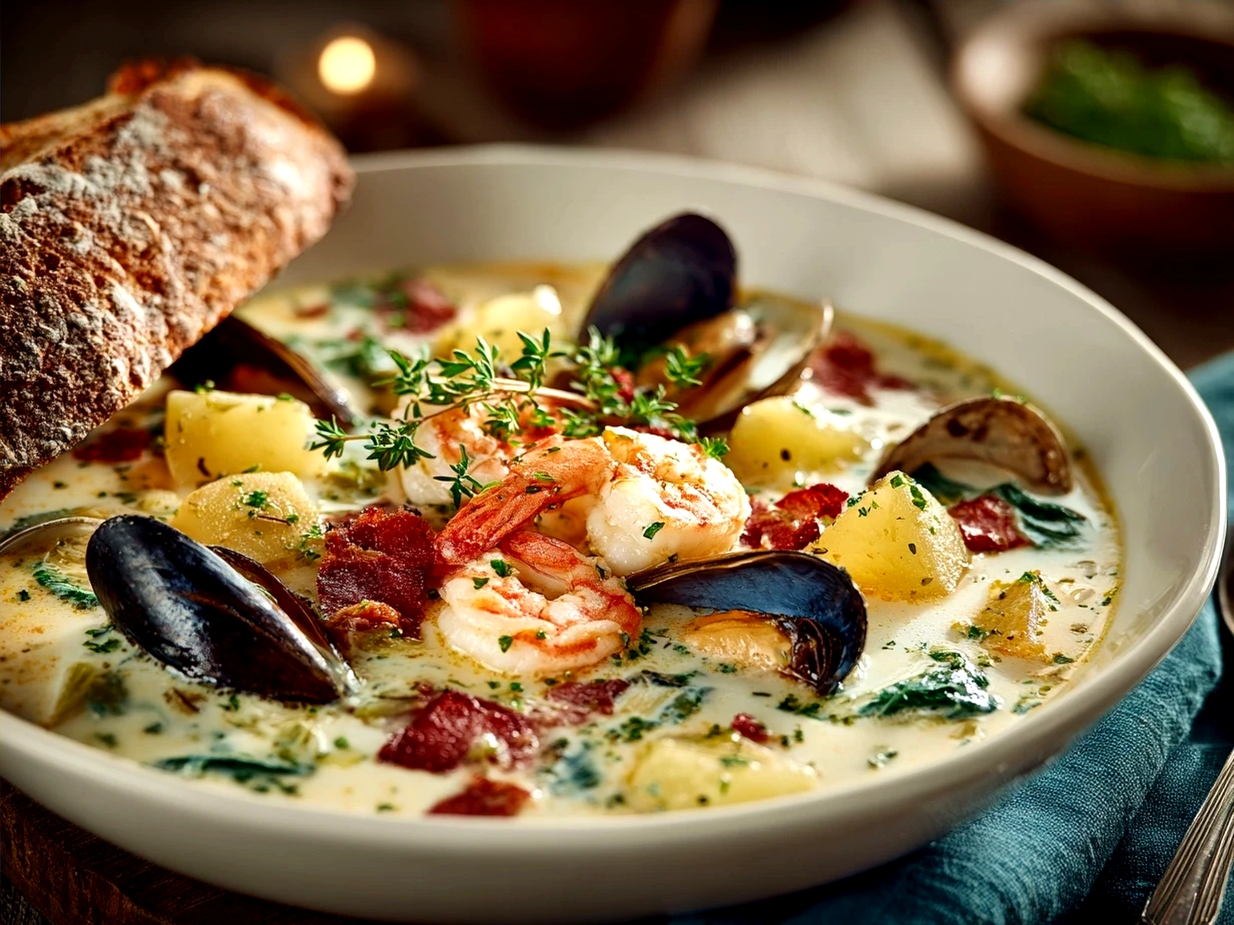 A rich and creamy seafood chowder packed with tender shrimp, clams, and fish, simmered with potatoes and aromatic herbs for a comforting coastal meal.