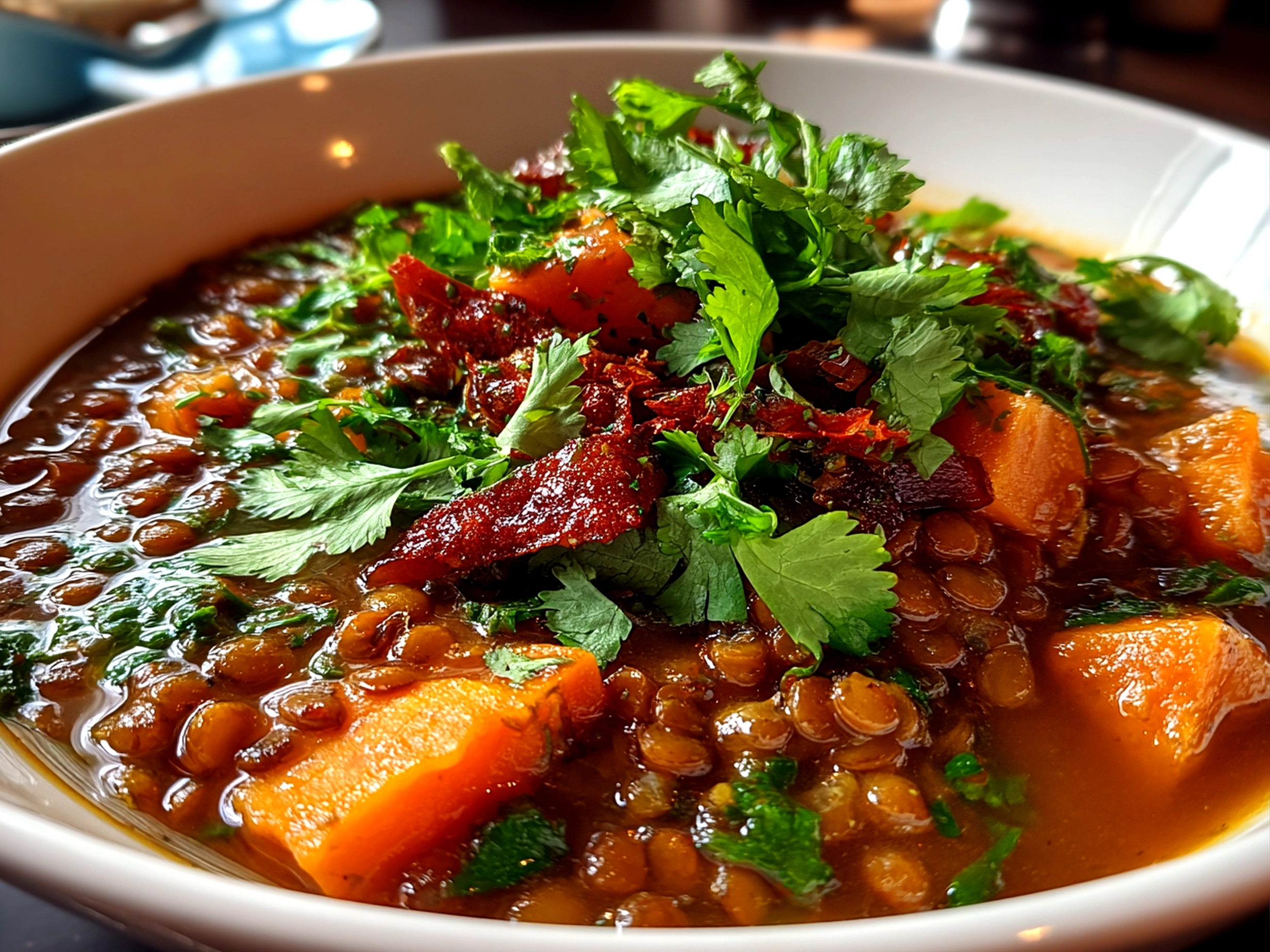 A hearty and wholesome sweet potato lentil stew bursting with warm spices and rich flavors, perfect for a nutritious and comforting meal.