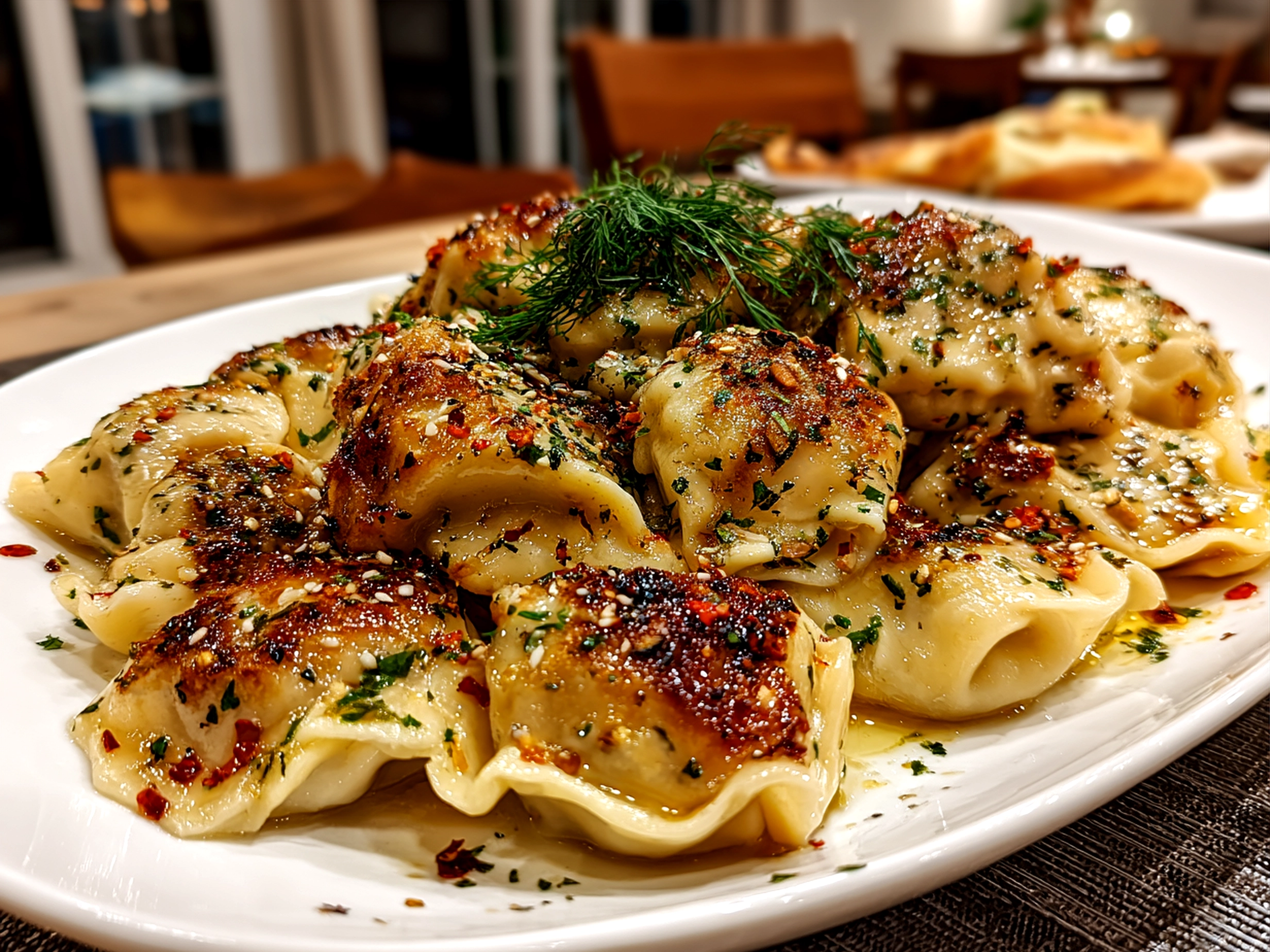 - Serve the cooked manti topped with garlic yogurt and drizzle the paprika butter over it. Garnish with fresh mint or parsley if desired.