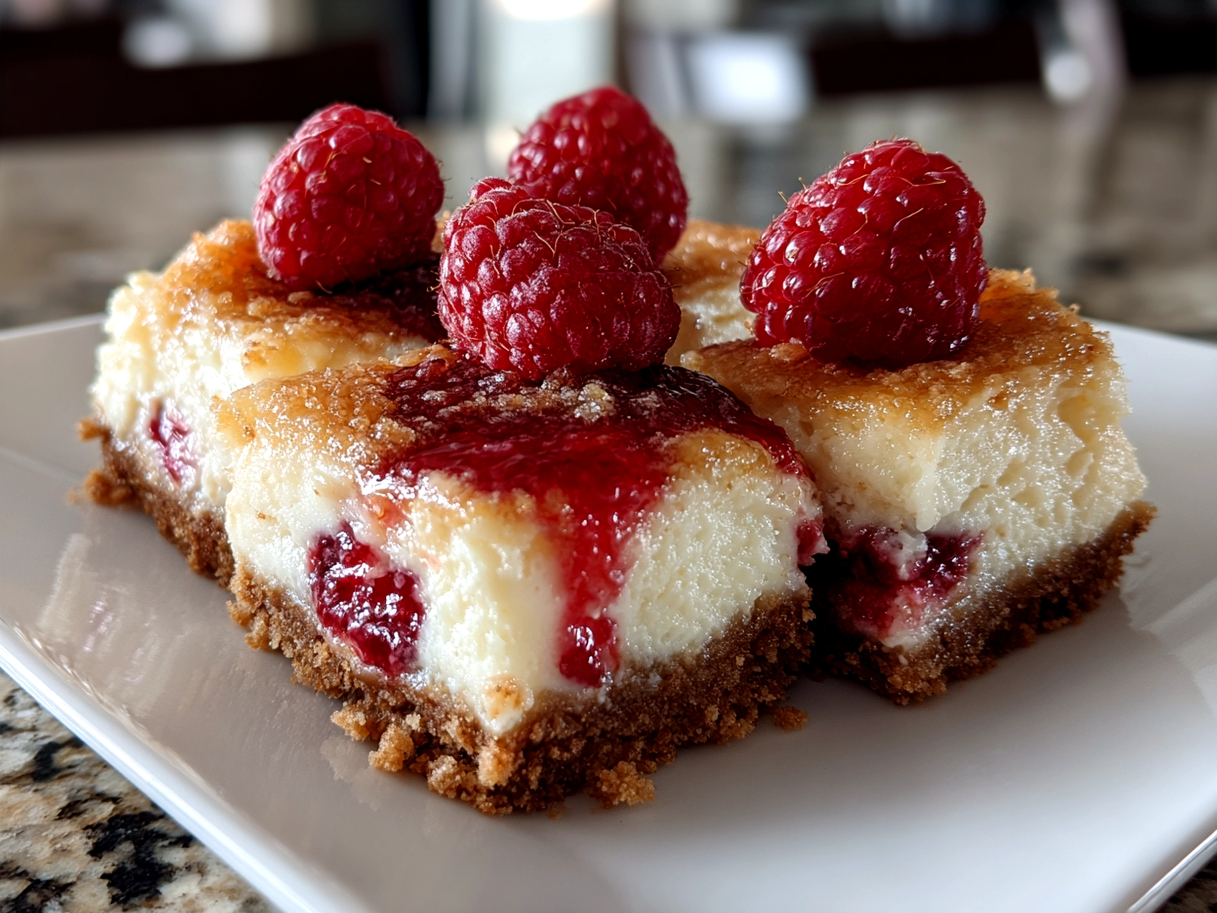 Delight in creamy white chocolate raspberry cheesecake bars featuring a buttery crust and a luscious berry swirl, perfect for any dessert occasion.